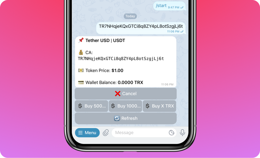 When you launch TronBullet on Telegram, the bot will automatically generate a unique TRON wallet address for you. This address is used to deposit TRX, which will then be used to execute trades on the platform.
