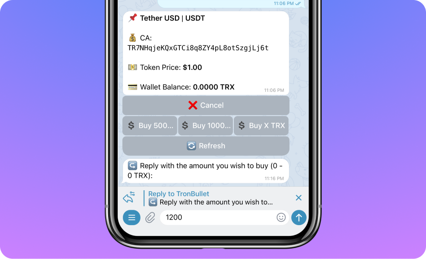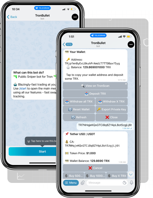 TronBullet is a sniping bot designed for the TRON network that allows you to execute token trades with exceptional speed and precision. Operated through Telegram, TronBullet makes it easy for users to buy TRON-based tokens at their desired prices, ensuring they can capitalize on market opportunities as quickly as possible.
